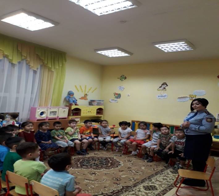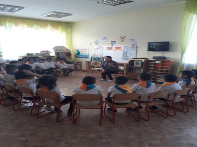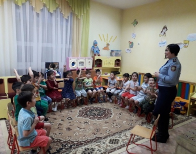 Бала өмір қауіпсіздігіне байланысты Ішкі істер басқырмасының қызметкері балалармен әңгіме сухбат жүргізді “Полицейский бұл кім” тақырыбында.