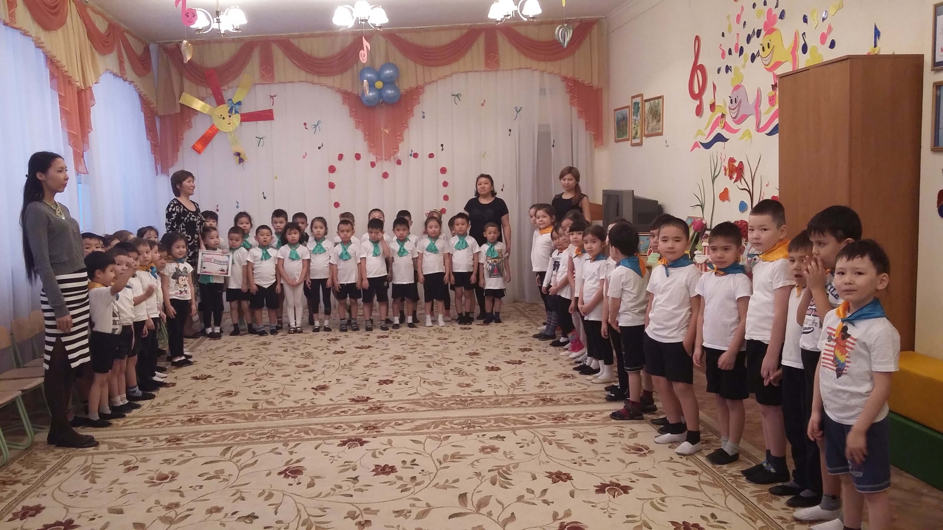 Салтанатты рәсімге балабақшаның педагогикалық ұжым қызметкерлері мен ІІ кіші «Меруерт», ортаңғы «Інжу», ересектер «Күншуақ»,«Қызғалдақ» топтарының балалары музыка залына жиналып, ҚР Мемлекеттік әнұранымен бастадық, әр топ өзінің топтарын, эмблемасын, ұранымен таныстырып өтті.