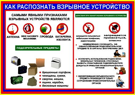 Помните! Внешний вид предмета может скрывать его настоящее назначение. В качестве камуфляжа для взрывных устройств используются обычные сумки, пакеты, свертки, коробки, игрушки и т.п.