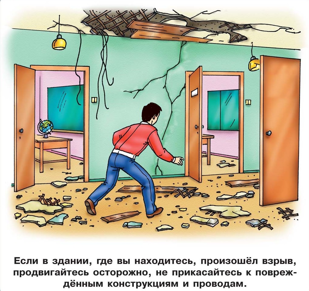 лежите на полу лицом вниз подальше от окон и дверей, не на прямой линии от оконных и дверных проемов, голову закройте руками и не двигайтесь;